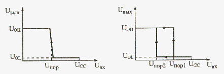 Малюнок 14.1Передавальні характеристики інвертора та тригера Шмітта з інверсією. У разі звичайного елемента з інверсією (а) при вхідних напругах нижче певного порогу спрацьовування Unop вихідний сигнал має високий рівень, а при вхідних напругах вище за цей поріг Unop - низький рівень. При цьому не має значення, зростає вхідна напруга або спадає.