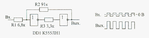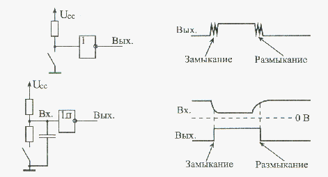Малюнок 14.7 Використання тригера Шмітта для придушення брязкоту контактів. Конденсатор заряджається і розряджається досить поволі, внаслідок чого короткі імпульси пригнічуються і не проходять на вихід трігера Шмітта. Номінал верхнього по схемі резистора повинен в даному випадку бути в 6-7 разів більше номінала нижнього, щоб резистивный дільник при замкнутому тумблері давав на вході трігера Шмітта рівень логічного нуля. Опори резисторів повинні бути порядка сотень ом - одиниць кілоом. Ємність конденсатора може вибиратися в широкому діапазоні і залежить від того, яка тривалість брязкоту контактів конкретного тумблера. |