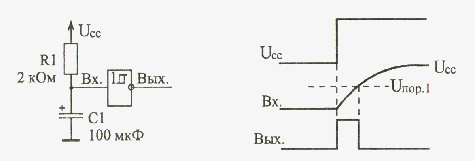 Малюнок 14.3 Графічне зображення тригера Шмітта. Найпоширеніше вживання трігерів Шмітта - це формувач сигналу початкового скидання по включенню живлення схеми. Необхідність такого сигналу скидання викликана тим, що при включенні живлення вихідні сигнали складних мікросхем, що мають внутрішню пам'ять (наприклад, регістрів, лічильників) можуть приймати довільні значення, що не завжди зручно. Для приведення їх в необхідний стан (частіше всього - для установки їх в нуль) якраз і покликаний сигнал початкового скидання.