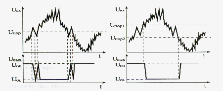 Малюнок 14.2 Реакція на спотворення вхідного сигналу інвертора та тригера Шмітта(справа). В стандартні серії цифрових мікросхем входять трігери Шмітта, що є інверторами (ТЛ2 - 6 інверторів), елементи 2І-НІ (ТЛЗ - 4 елементи) і елементи 4І-НІ (ТЛ1 - 2 елементи). Порогові напруги складають для всіх цих мікросхем близько 1,7 В (Unop1) і близько 0,9 В (Unop2)