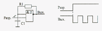 Малюнок 14.5 Побудова генератора прямокутних коливань на основі тригера Шмітта. Ще одне вживання трігера Шмітта - побудова генераторів імпульсів. На відміну від генераторів на звичайних інверторах в даному випадку схема виходить набагато простішою: потрібен всього лише один інвертуючий трігер Шмітта, один резистор (з номіналом порядка сотень Ом) і один конденсатор (малюнок 14.5). При цьому дуже зручно, що конденсатор одним виводом приєднаний до загального дроту, до «землі». Це дозволяє застосовувати електролітичні конденсатори великої місткості, а також змінні конденсатори. Використовування двовходових трігерів Шмітта дає можливість легко дозволяти або забороняти генерацію за допомогою управляючого сигналу Разр. При рівні логічної одиниці на вході Разр. генерація буде, при рівні логічного нуля генерації немає.