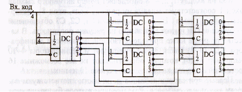 При цьому старші розряди коду подаються на основний дешифратор, виходи якого дозволяють роботу декількох додаткових дешифраторів. На з'єднані входи цих додаткових дешифраторів подаються молодші розряди вхідного коду. Використовуючи п'ять мікросхем дешифраторів 2-4 можна одержати дешифратор 4-16, як показано на малюнку (хоча краще, звичайно, узяти готову мікросхему). Так само на дев'яти мікросхемах 3-8 можна реалізувати дешифратор 6-64, а на сімнадцяти мікросхемах 4-16 - дешифратор 8-256.