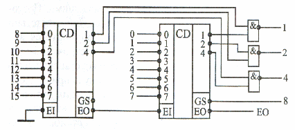 Малюнок 16.8. Шифратор 16-4 на двох шифраторах 8-3.