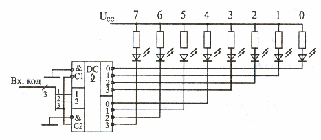 Дешифратори, що мають виходи типа ОК (ИД5, ИД10), зручно застосовувати в схемах позиційної індикації на світлодіодах. На малюнку 16.5 приведений приклад реалізації позиційного індикатора на мікросхемі ИД5, яка є двома дешифраторами 2--4 із з'єднаними входами для подачі коду і стробами, що дозволяють легко будувати дешифратор 3-8. При цьому старший розряд коду вибирає один з дешифраторів 2-4 (нуль відповідає верхньому по схемі дешифратору, а одиниця - нижньому). Тобто в даному випадку номер світлодіода, що горить, рівний вхідному коду дешифратора. Така індикація називається позиційною.
