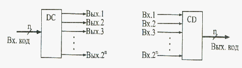 Функції дешифраторів і шифраторів зрозумілі з їх назв. Дешифратор перетворить вхідний двійковий код в номер вихідного сигналу (дешифрує код), а шифратор перетворить номер вхідного сигналу у вихідний двійковий код (шифрує номер вхідного сигналу). Кількість вихідних сигналів (і відповідних їм виходів) дешифратора і вхідних сигналів (і відповідних їм входів) шифратора рівна кількості можливих станів двійкового коду (вхідного коду у дешифратора і вихідного коду у шифратора), тобто 2П, де п - розрядність двійкового коду (малюнок 16.1). Мікросхеми дешифраторів позначаються на схемах буквами DC (від англійського Decoder), а мікросхеми шифраторів - CD (від англійського Coder).