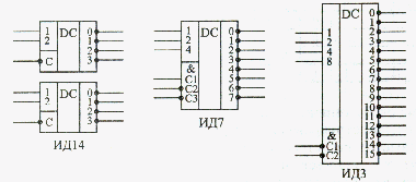 В стандартні серії входять дешифратори на 4 виходи (2 розряди вхідного коду), на 8 виходів (3 розряди вхідного коду) і на 16 виходів (4 розряди вхідного коду). Вони позначаються відповідно як 2-4, 3-8, 4-16. Розрізняються мікросхеми дешифраторів входами управління (дозволу/заборони вихідних сигналів), а також типом виходу: 2С або ОК. Вихідні сигнали всіх дешифраторів мають негативну полярність. Входи, на які поступає вхідний код, називають часто адресними входами. Позначають ці входи 1, 2, 4, 8, де число відповідає вазі двійкового коду (1 - молодший розряд, 2 - наступний розряд і т. д.) або А0, Al, A2, A3. У вітчизняних серіях мікросхеми дешифраторів позначаються буквами ИД. На малюнку 16.2 показано три найтиповіші мікросхеми дешифраторів.