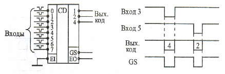 Інверсія вихідного коду призводить до того, що при приході нульового вхідного сигналу на виході формується не нульовий код, а код 111, тобто 7. Так само при приході, наприклад, третього вхідного сигналу на виході формується код 100, тобто 4, а при приході п'ятого вихідного сигналу - код 010, тобто 2.