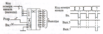 Малюнок 16.4. Вмикання дешифратора як демультиплексора. Як і для будь-яких інших цифрових мікросхем, для дешифраторів найбільш критична ситуація одночасної або майже одночасної зміни вхідних сигналів. Наприклад, якщо строби С постійно дозволяють роботу дешифратора, то у момент зміни вхідного коду на будь-якому виході дешифратора можуть з'явитися паразитні негативні короткі імпульси. Це може бути пов'язано як з неодночасним виставлянням розрядів коду (через недосконалість мікросхем джерел коду або через різні затримки розповсюдження по лініях зв'язку), так і з внутрішніми затримками самих мікросхем дешифраторів.