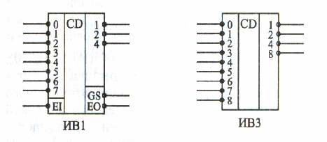 На малюнку 16.6 показано для прикладу дві мікросхеми шифраторів: ИВ1 і ІВЗ. Перша має 8 входів і 3 виходи (шифратор 8-3), а друга - 9 входів і 4 виходи (шифратор 9-4). Всі входи шифраторів інверсні (активні вхідні сигнали - нульові). Всі виходи шифраторів теж інверсні, тобто формується інверсний код. Мікросхема ИВ1 крім 8 інформаційних входів і 3 розрядів вихідного коду (1, 2, 4) має інверсний вхід дозволу -EI, вихід ознаки приходу будь-якого вхідного сигналу -GS, а також вихід перенесення -ЕО, що дозволяє об'єднувати декілька шифраторів для збільшення розрядності.