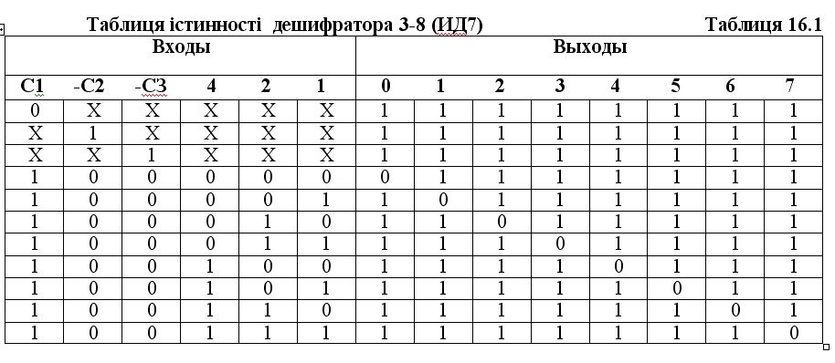 Малюнок 16.2. Приклади мікросхем дешифраторів. Код на входах 1,2,4,8 визначає номер активного виходу (вхід 1 відповідає молодшому розряду коду, вхід 8 - старшому розряду коду). Входи дозволу Cl, C2, СЗ з'єднані по функції І і мають вказану на малюнку полярність. Як приклад нижче приведена таблиця істинності дешифратора ИД7 (3-8) (таблиця. 16.1). Існують і дешифратори 4-10 (наприклад, ИД6), які обробляють не всі можливі 16 станів вхідного коду, а тільки перші 10 з них.