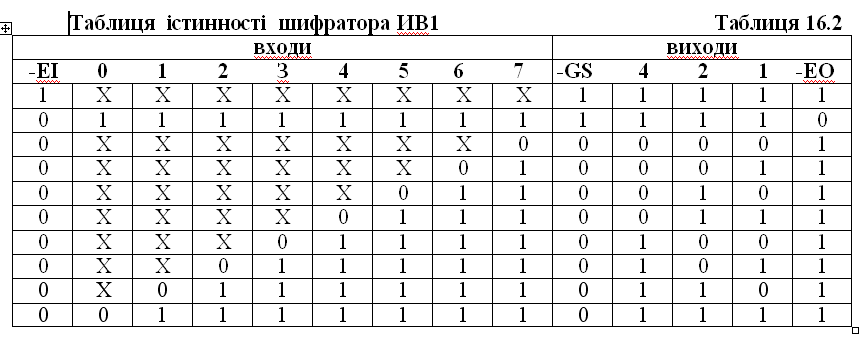 З таблиці видно, що на виходах коду 1, 2, 4 формується інверсний двійковий код номера вхідної лінії, на який приходить негативний вхідний сигнал. При одночасному надходженні декількох вхідних сигналів формується вихідний код, відповідний входу з найбільшим номером. Тобто старші входи мають пріоритет перед молодшими. Тому такий шифратор називається пріоритетним. За відсутності вхідних сигналів (другий рядок таблиці) формується вихідний код 111. Одиничний сигнал -EI (перший рядок) забороняє роботу шифратора (всі вихідні сигнали встановлюються в одиницю). На виході -GS виробляється нуль при приході будь-якого вхідного сигналу, що дозволяє, зокрема, відрізнити ситуацію приходу нульового вхідного сигналу від ситуації відсутності будь-яких вхідних сигналів. Вихід -ЕО стає активним (нульовим) за відсутності вхідних сигналів, але при дозволі роботи шифратора сигналом -EI.