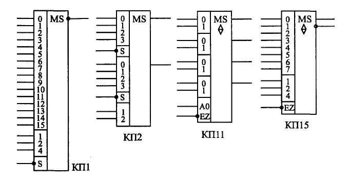 Малюнок 17.1. Приклади мікросхем мультиплексорів. На малюнку 17.1 показано для прикладу декілька мікросхем мультиплексорів з складу стандартних серій. У вітчизняних серіях мультиплексори мають код типу мікросхеми КП. На схемах мікросхеми мультиплексорів позначаються буквами MS.