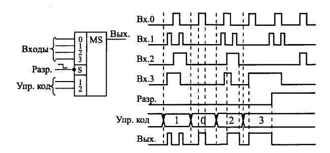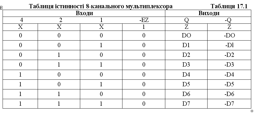 На малюнку 17.2 приведена тимчасова діаграма роботи 4-ка-нального мультиплексора. Залежно від вхідного коду на вихід передається один з чотирьох вхідних сигналів. При забороні роботи на виході встановлюється нульовий сигнал незалежно від вхідних сигналів.