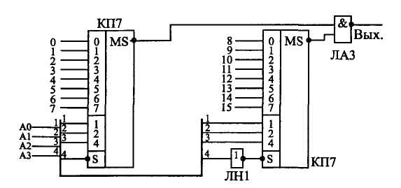 Малюнок 17.3. Об'єднання мультиплексорів для збільшення кількості каналів. По-перше, управляючий код може перемкнутися відразу після зміни передаваного в даний момент на вихід вхідного сигналу або відразу перед зміною вхідного сигналу, який передаватиме на вихід наступний код. По-друге, сигнали (розряди) управляючого коду можуть перемикатися не одночасно, що приведе до короткочасної передачі на вихід вхідного сигналу, не відповідного жодному із значень коду. У будь-якому випадку у момент перемикання каналів сигнал на виході мультиплексора не визначений. |