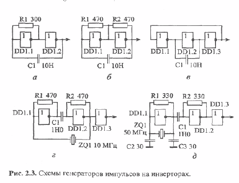 Сам інвертор як найпростіший елемент частіше за інші елементи використовується в нестандартних включеннях. Наприклад, інвертор звичайно застосовується в схемах генераторів прямокутних імпульсів (малюнок. 8.2), вихідний сигнал яких періодично змінюється з нульового рівня на одиничний і назад. Всі приведені схеми, окрім схеми д), виконані на елементах К155ЛН1, але можуть бути реалізовані і на інверторах інших серій при відповідній зміні номіналів резисторів. Наприклад, для серії К555 номінали резисторів збільшуються приблизно втричі. Схема д) виконана на елементах КР531ЛН1, оскільки вона вимагає високої швидкодії інверторів.