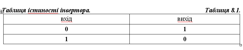 Найпростіший логічний елемент - це інвертор (логічний елемент НІ, inverter). Інвертор виконує найпростішу логічну функцію - інвертування, тобто зміна рівня вхідного сигналу на протилежний. Інвертор має всього один вхід і один вихід. Вихід інвертора може бути типу 2С або типа ОК. На малюнку. 2.1.а. показані умовні позначення інвертора, а в таблиці. 8.1 представлена таблиця істинності інвертора.
